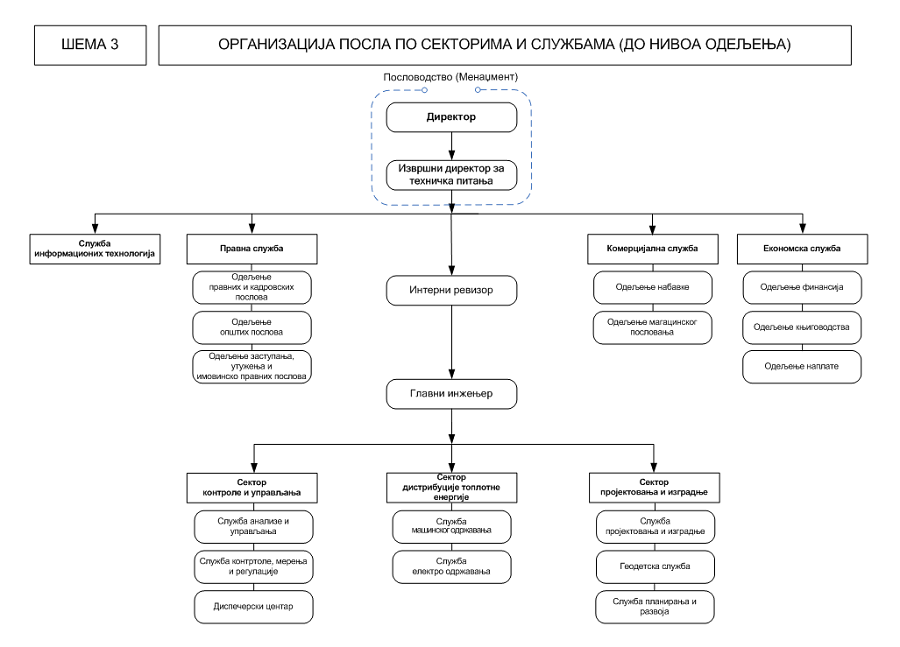 Сектор контроле и управљања, Сектор дистрибуције топлотне енергије, Сектор пројектовања и изградње, Правна служба, Економска служба, Комерцијална служба и Служба информационих технологија.